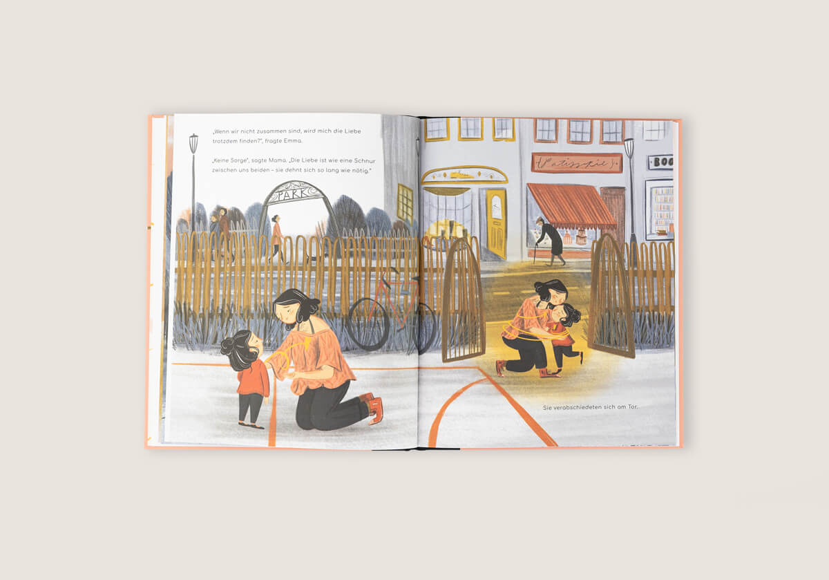 „Wenn wir nicht zusammen sind, wird mich die Liebe trotzdem finden?" – „Keine Sorge", sagt Mama. „Die Liebe ist wie eine Schnur zwischen uns beiden – sie dehnt sich so lang wie nötig."