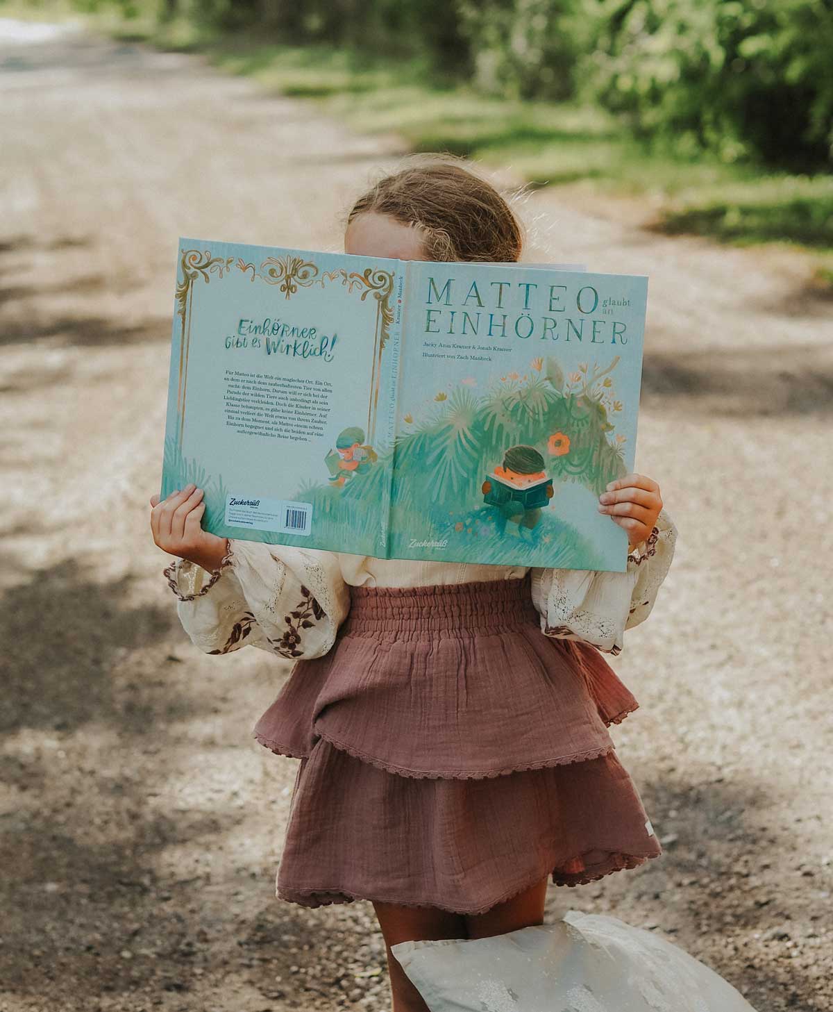 „Matteo glaubt an Einhörner” ist ein magisches Kinderbuch, das sich spielerisch mit ausdrucksstarken Illustrationen mit dem Thema Selbstzweifel und dem Druck von außen beschäftigt. Es soll Kindern dabei helfen, an ihre Träume und Überzeugungen zu glauben – ganz egal, was andere sagen.